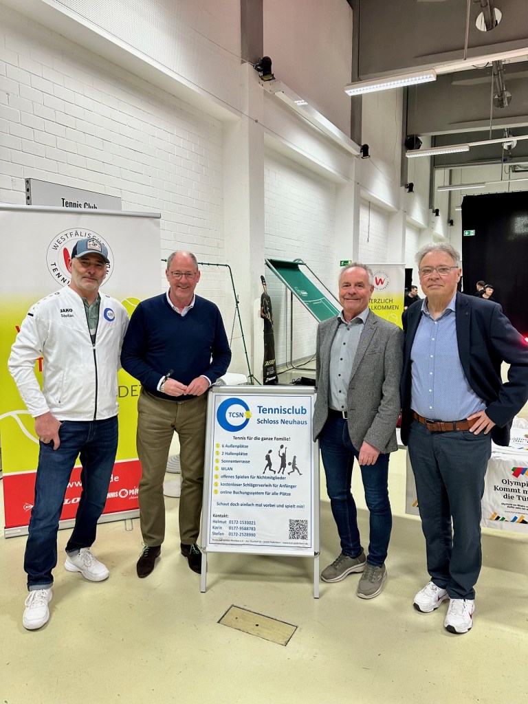 Auf der Frey Expo, die von Ina Frey wieder hervorragend organisiert wurde, kam bei uns am Stand sogar der Paderborner Bürgermeister, Stefan-Oliver Strate, und auch der Vizepräsident des Landessportbund, Diethelm Krause, vorbei. Als Vertreter für den Westfälischen Tennis Verband, war Elmar Schlüter dabei.
